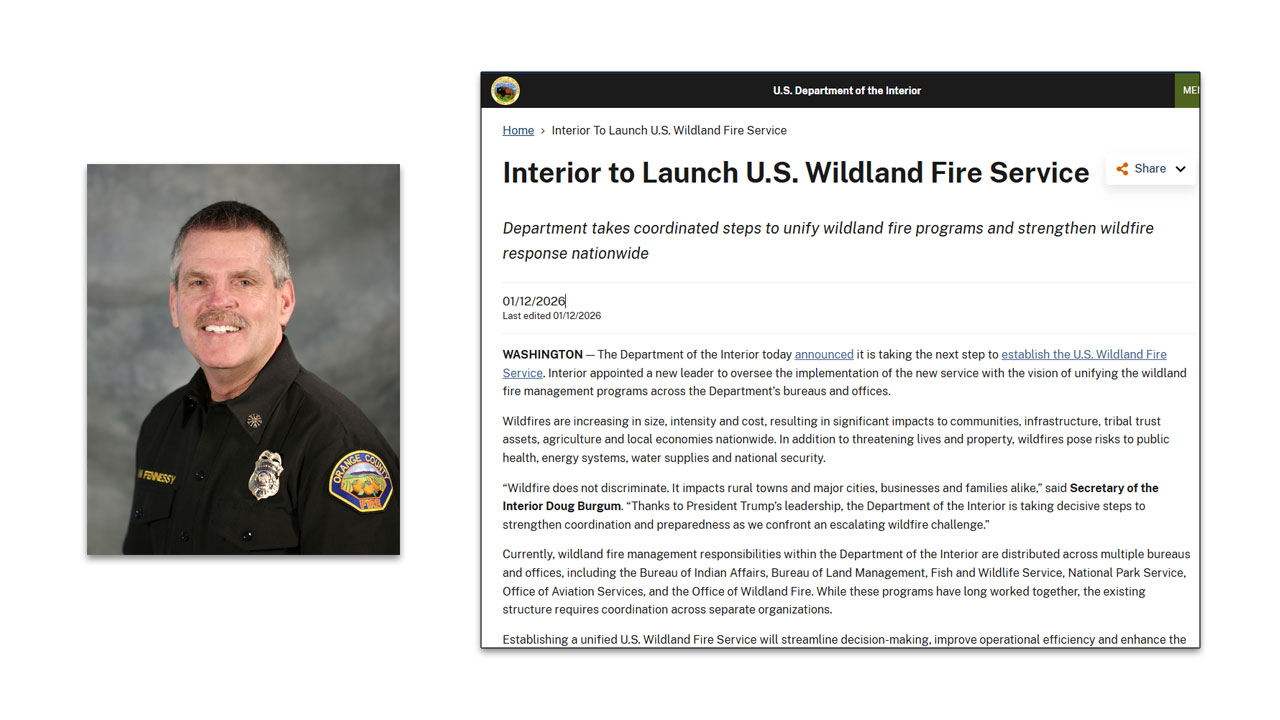 The U.S. Department of the Interior (DOI) announced the creation of the U.S. Wildland Fire Service (USWFS). Fire Chief Brian Fennessy has been appointed the Director of the new USWFS.